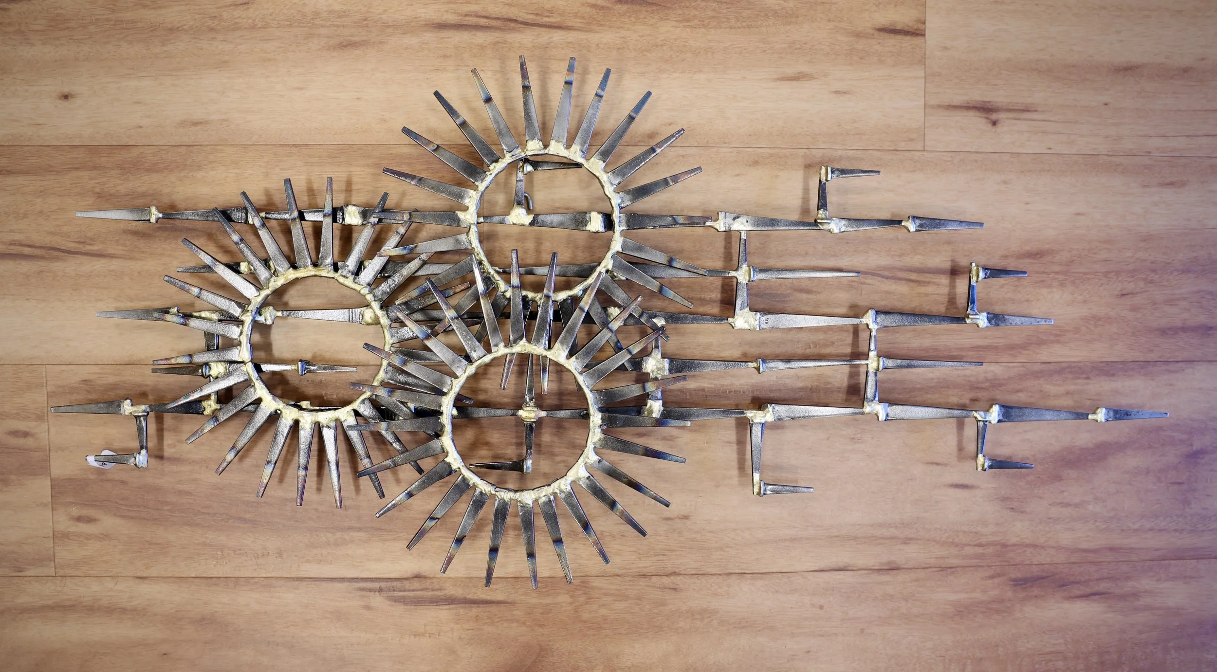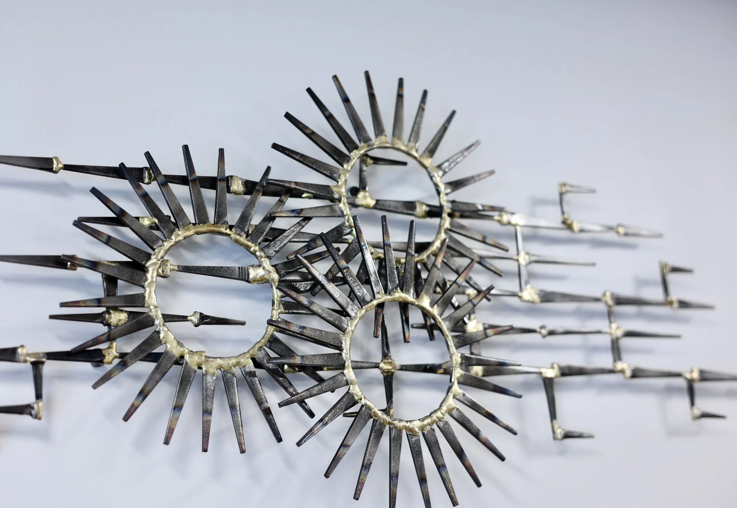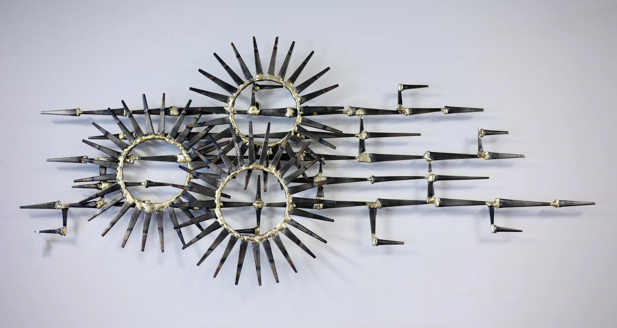 Horizontally arranged this piece measures 31” in length and 14” high. Made with cut masonry nails and brazed with bronze. A clear coat applied.